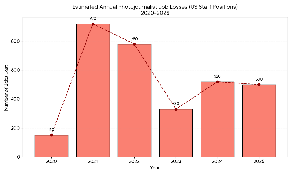 Photojournalists have historically been “hit the hardest” among newsroom categories, often losing staff positions faster than reporters or editors as outlets pivot to freelance models or user-generated content.*